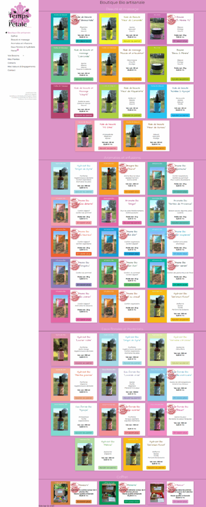 Nous avons conçu une expérience e-commerce fluide et cohérente, où chaque page adopte une identité chromatique propre tout en préservant l’unité de la charte graphique. Le système de couleurs s’adapte subtilement aux teintes des étiquettes produits, créant une continuité visuelle naturelle entre l’interface et les articles présentés. Cette approche permet à chaque univers de gamme de s’exprimer pleinement, sans rompre la cohérence d’ensemble du site.