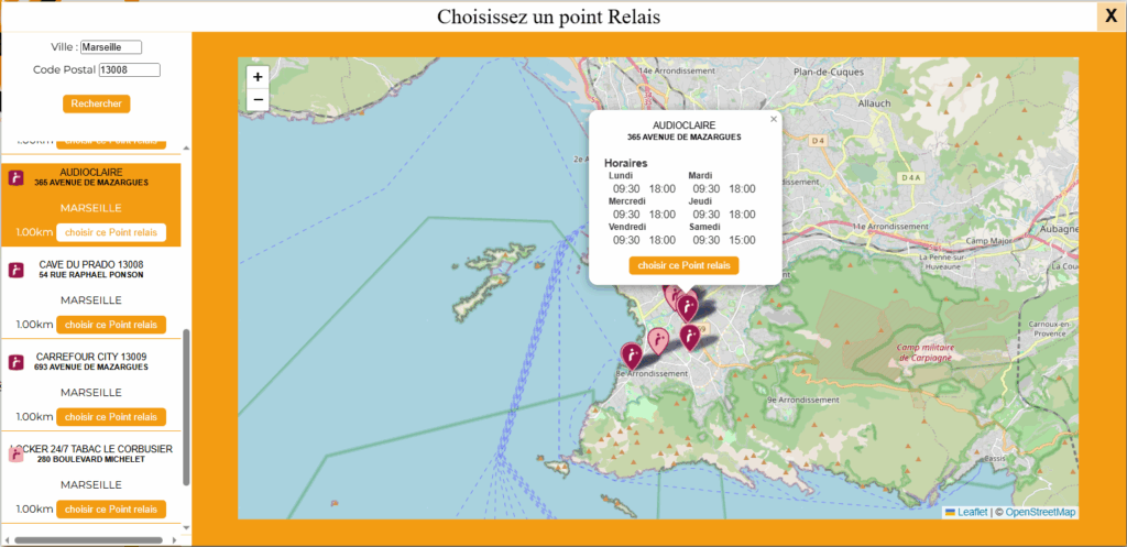 Nous avons développé un plugin sur-mesure pour intégrer le choix du point relais directement dans le parcours d’achat. L’interface cartographique s’insère naturellement dans le tunnel de commande, offrant une sélection intuitive et géolocalisée des points de retrait disponibles. L’outil a été pensé pour minimiser les frictions : quelques clics suffisent pour visualiser, comparer et choisir le relais le plus adapté. Cette fonctionnalité renforce l’autonomie de l’utilisateur tout en fluidifiant l’expérience de livraison, un élément clé de la satisfaction client dans le commerce en ligne.